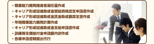 当サービスは、「社員研修をしたいけど予算がない」という中小企業向けに、研修費用の50%もの助成を受けられるキャリア形成促進助成金を利用して、継続的・体系的に人材育成ができる仕組みづくりをサポートするものです。単なる助成金の申請書作成代行ではなく、経営理念や事業内容から御社に求められる人材像を明らかにしたうえで、実際に育成していくための能力開発計画を立案していきます。