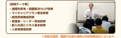 当社の研修は、能力開発のみにとどまらず、実際に経営課題を解決することを主な目的としています。参加者には一般的な知識・スキルを習得して頂くだけではなく、現実に直面されている課題を解決して頂く「仕組み」をカリキュラムに組み込むことで、「効果が見える」研修をご提供しています。