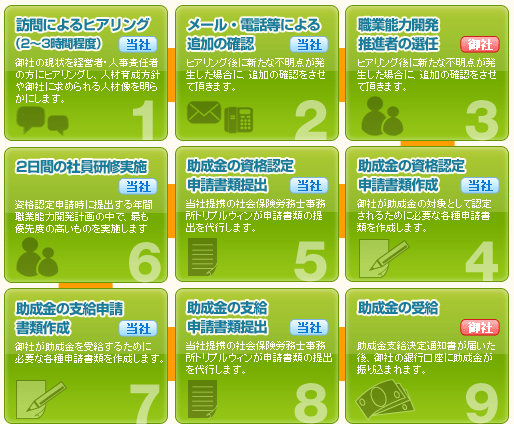 さらに、計画立案時に把握できる御社の現状を踏まえ、最も優先度の高い内容の社員研修を合わせて実施することで、助成金を受給しながら人材育成を行う仕組みをいち早く利用できるようにします。